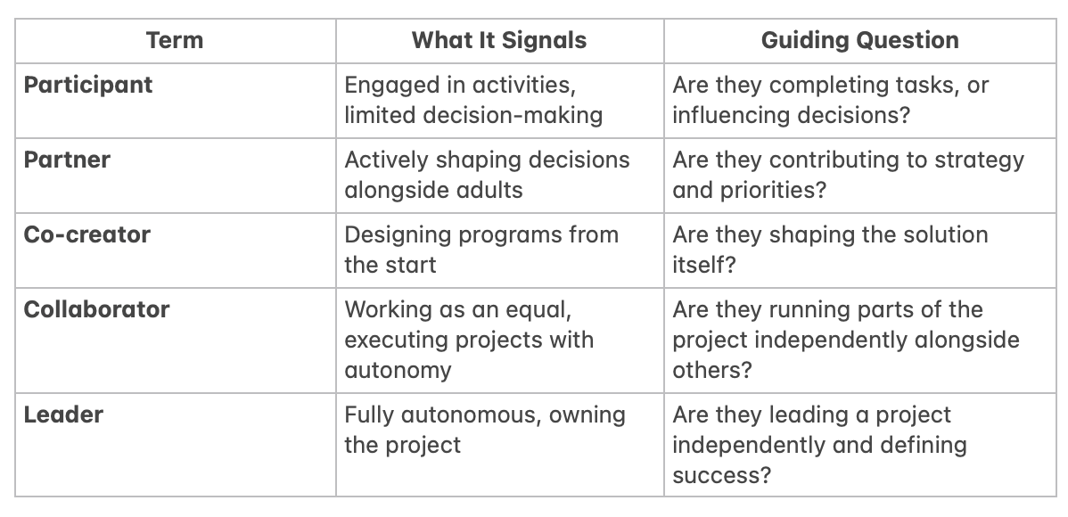 Shifting language is not about picking a trendier term — it’s about accurately reflecting young people’s role and agency. Words matter because they signal how much influence and trust young people are given. Consider this framework: